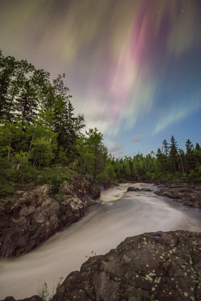 Now, that’s not to say the naked eye can’t see color in an aurora display. We can, and do. I have been lucky enough, and out often enough to see some surreal, colorful, mindblowing displays. Reds, purples, greens and even yellows, all with the naked eye. It can greatly depend on the strength of the display and how dark your skies are. One of the best, most dramatic displays I have seen was long before I was photographing them and they were multi colored and fantastic. A group of friends and I were dining at the Gunflint Lodge one fall night in 1995 when the waiter came and asked if we’d like to finish our drinks out on the dock to watch the northern lights. The whole restaurant cleared out and onto the shores of Gunflint Lake and we were all treated to one of the best diplays I have witnessed to date.