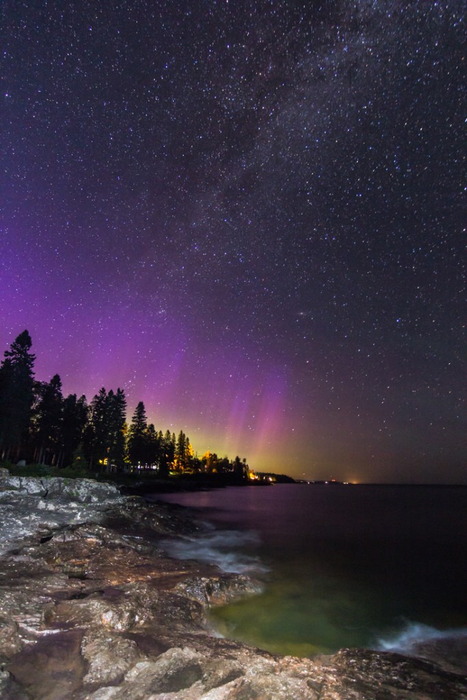 Your best bet during a standard show would be to head inland, somewhere up over the Sawtooth Mountains. I like to head to one of the many lakes in the area. You can do a quick Google Map search for the area you may be vacationing in. Find a lake or open area with a nice view to the North. Boat landings are a good start. The lights can be in all directions at times, but a smaller display may be best viewed looking north. If you are on Lake Superior and can’t get inland, you’ll still want to find a nice point of land that sticks out a bit affording you a view north. Some of the best places to go would be the Gunflint, Caribou and Sawbill trails for inland viewing. On a good night, the Grand Marais harbor can give you a view in the right direction if you get out towards the breakwall. As you go west/southwest on 61, the Sawtooth Range gets in the way a bit so you’ll have to find a point of shore that sticks out a bit and orients you northish.
