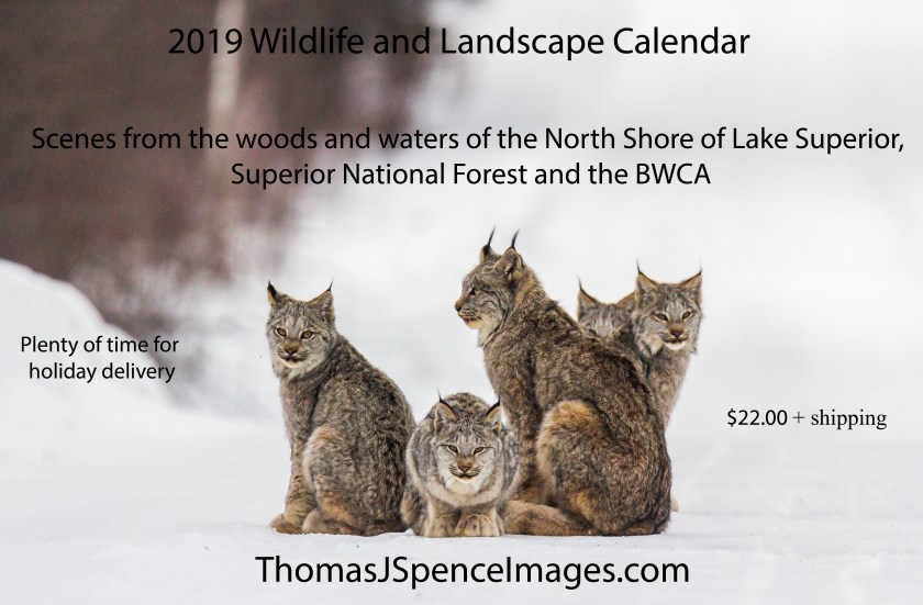I also have 2020 Calendars available for purchase now. I made two different calendars, all with different images. The Up North – Superior Country Calendar is all landscapes of Lake Superior, the surrounding woods and the BWCA. The Superior Wildlife Calendar is all wildlife from the woods of the Arrowhead region. You can take a look at a preview and order at the links or this link below. I appreciate your support. They would make great gifts. Print within 5 days of order and shipping info will be shown when you order. Plenty of time for holiday deliveries. http://www.lulu.com/spotlight/ThomasSpence